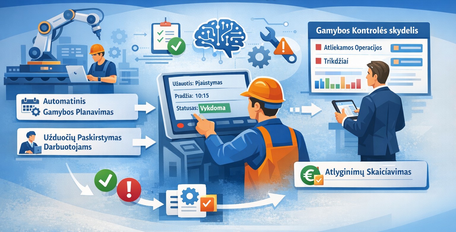 Žemiau apžvelgiami sprendimai, kaip be rankinio duomenų suvedimo automatizuoti gamybos operacijų planavimą, užduočių paskirstymą vykdytojams, jų apskaitą bei atlyginimų skaičiavimą pagal individualiai atliktus darbus.