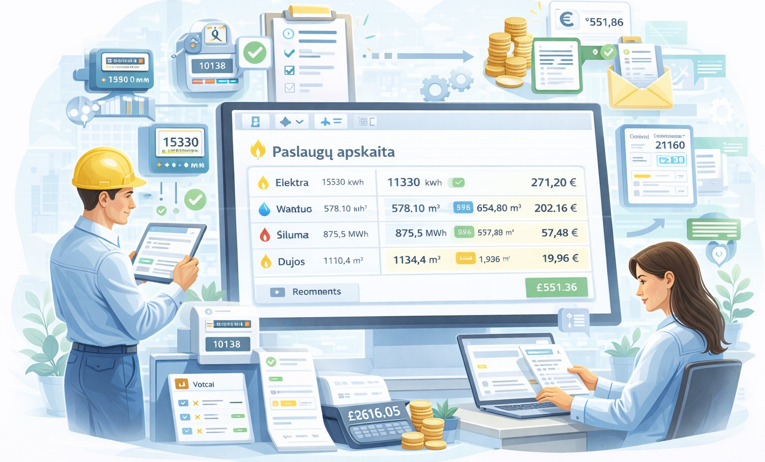 - elektros, vandens, šildymo, dujų ir kitų paslaugų apskaita;